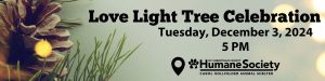 The holidays are a time of joy, laughter, family and friends. For many of us, it is also a time of giving and honoring our loved ones. The 60th Anniversary “Love Light” Holiday Tree is a heartfelt way to acknowledge loved ones and pets who bring joy to our lives. A Love Light is a perfect gift, allowing you to recognize someone special while helping animals in your community.